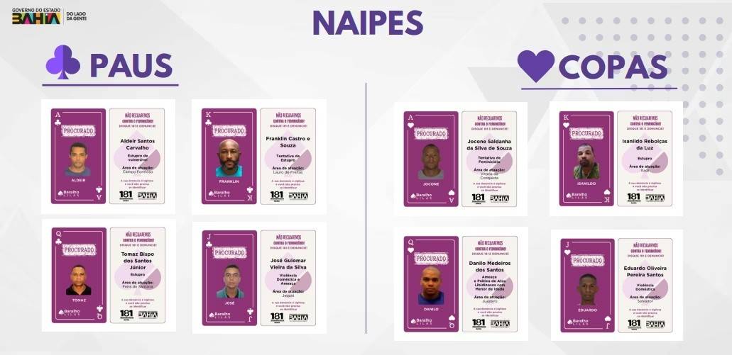 Idealizado pela SSP, em parceria com a SPM, o Baralho Lilás exibirá 16 procurados por ações ilícitas praticadas na capital baiana, na Região Metropolitana de Salvador (RMS) e no interior do estado.